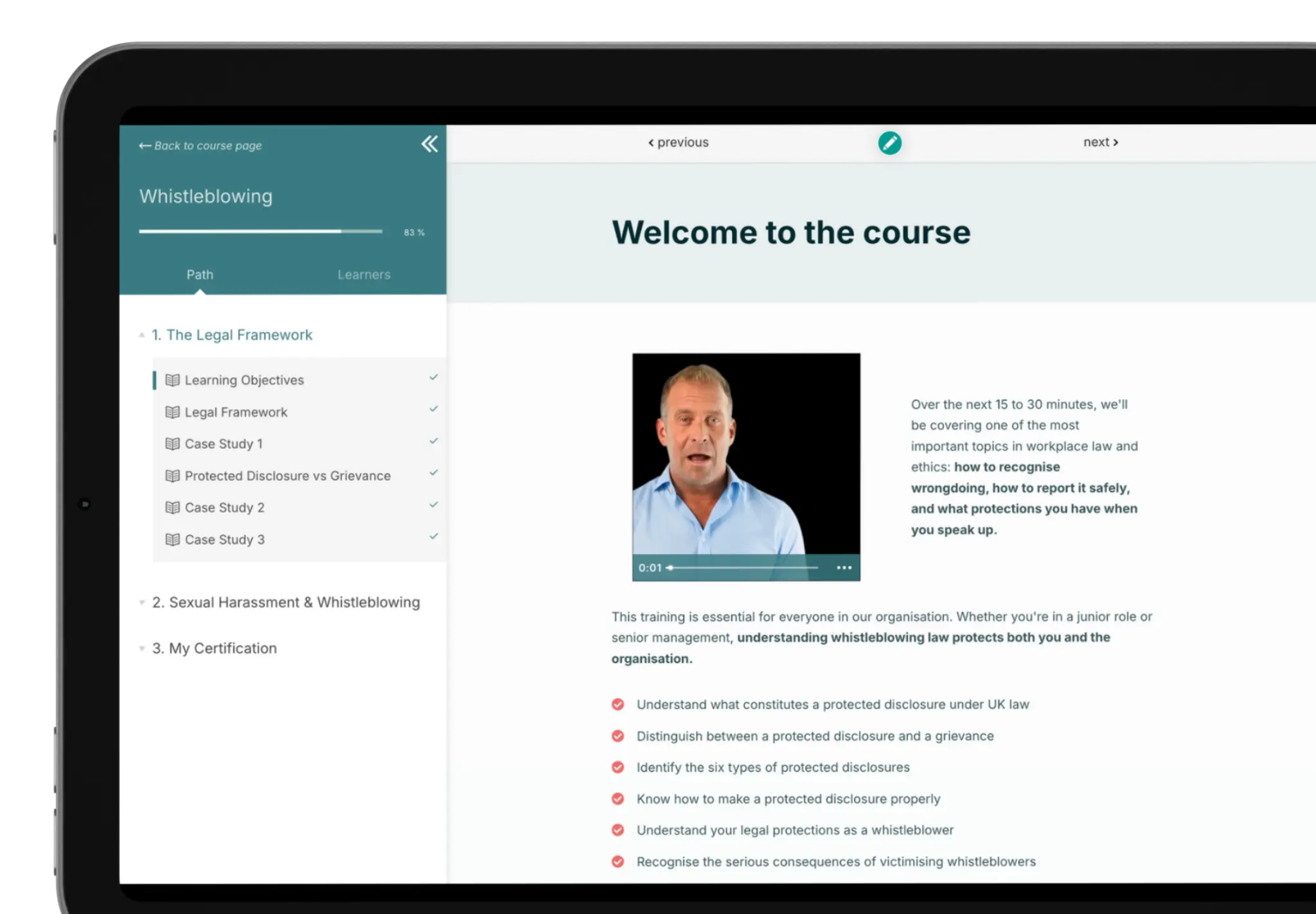 Our lawyer–led Whistleblowing E–Learning Course gives employees a clear, practical understanding of protected disclosures under UK law, helping them report issues responsibly and reduce the risk of claims to your business.